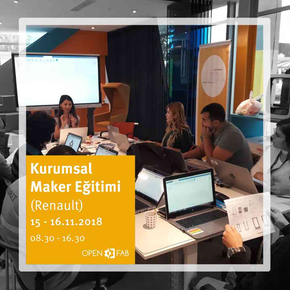Renault çalışanlarına yönelik geliştirdiğimiz Kurumsal Maker Eğitimlerine Kasım ayında bilgisayar ortamında üç boyutlu modelleme yaparak başlamayı, ardından üç boyutlu yazıcı teknolojisi ile hızlı prototipleme sürecini deneyimlemelerini sağlayacağımız eğitim sonrasında katılımcıların kendi tasarımlarını modelleyerek ürettikleri bir ortam yaratmak amaçlanmıştır.