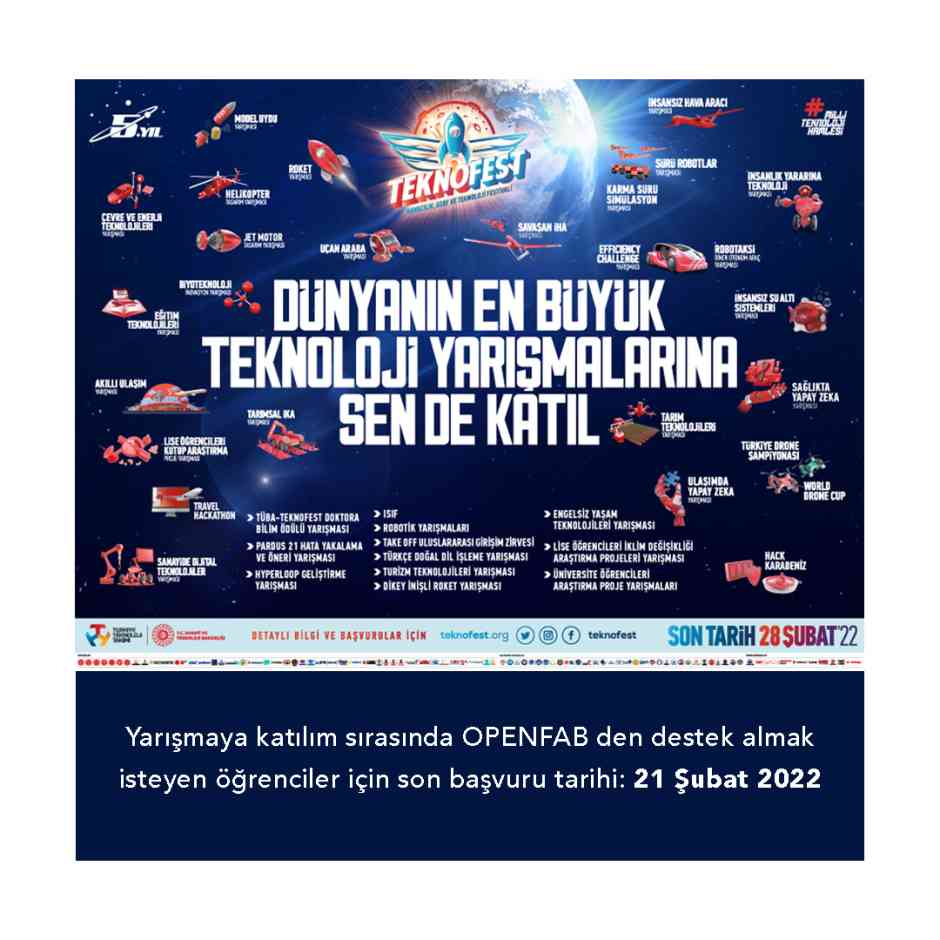 Türkiyenin en büyük teknoloji festivali olan Teknofest yarışması bu sene Samsun’da düzenlenecektir. Toplamda 41 farklı kategoride düzenlenecek olan yarışmanın katılımı ücretsizdir. Başvurularda herhangi bir bölüm, kişi sayısı ve sınıf şartı aranmamaktadır. Kategorilere uygun proje fikri olan öğrenciler Openfab atölyesinin imkanlarından ve mentorlük desteğinden faydalanarak projelerini geliştirebilir ve yarışmaya başvurularını tamamlayabilir. Bu süreçte Openfab'den destek almak isteyen öğrencilerin başvuru formunu eksiksiz doldurması gerekmektedir. Sorularınız için openfab@ozyegin.edu.tr adresinden bizimle iletişime geçebilirsiniz. 'İnsanlık Yararına Teknoloji Yarışması' katergorisine katılım yapacak öğrencilere öncelik tanınacaktır.