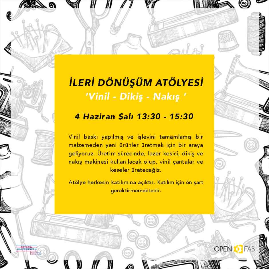 Vinil baskı yapılmış ve işlevini tamamlamış bir malzemeden yeni ürünler üretmek için bir araya geliyoruz. Üretim sürecinde, lazer kesici, dikiş ve nakış makinesi kullanılacak olup, vinil çantalar ve keseler üreteceğiz. Atölye herkesin katılımına açıktır. Katılım için ön şart gerektirmemektedir.