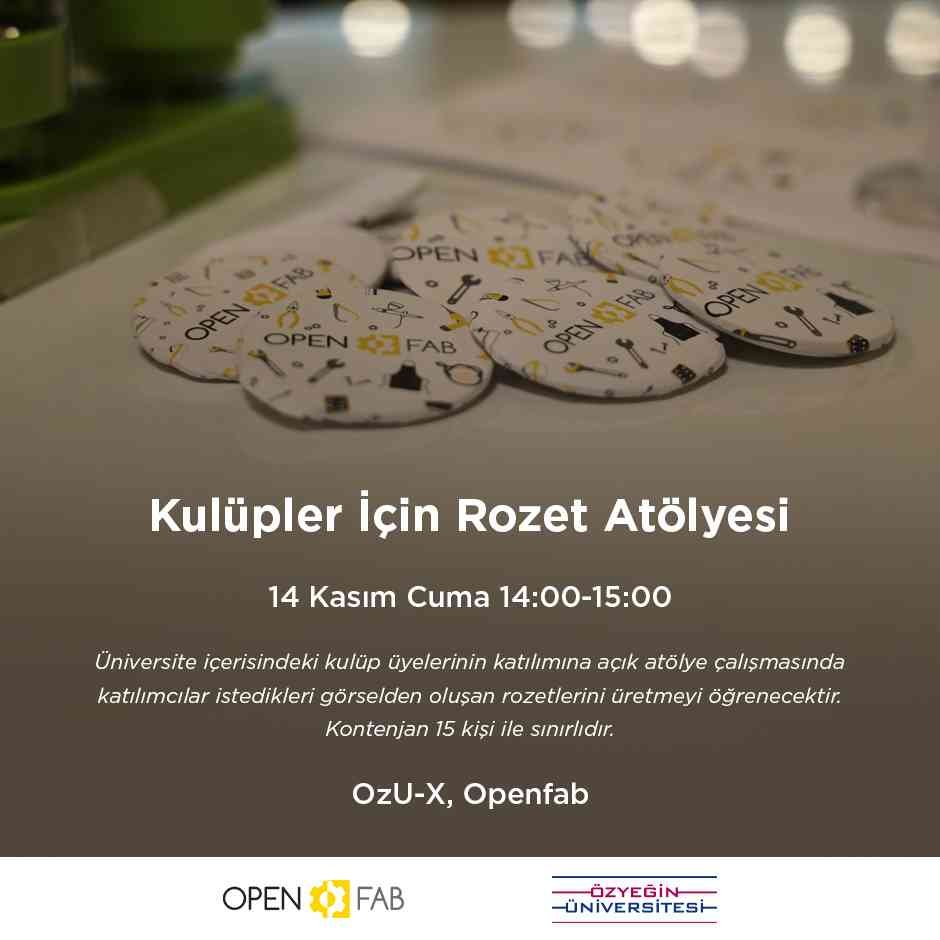 Üniversite içerisindeki kulüp üyelerinin katılımına açık atölye çalışmasında katılımcılar istedikleri görselden oluşan rozetlerini üretmeyi öğrenecektir. Kontenjan 15 kişi ile sınırlıdır.