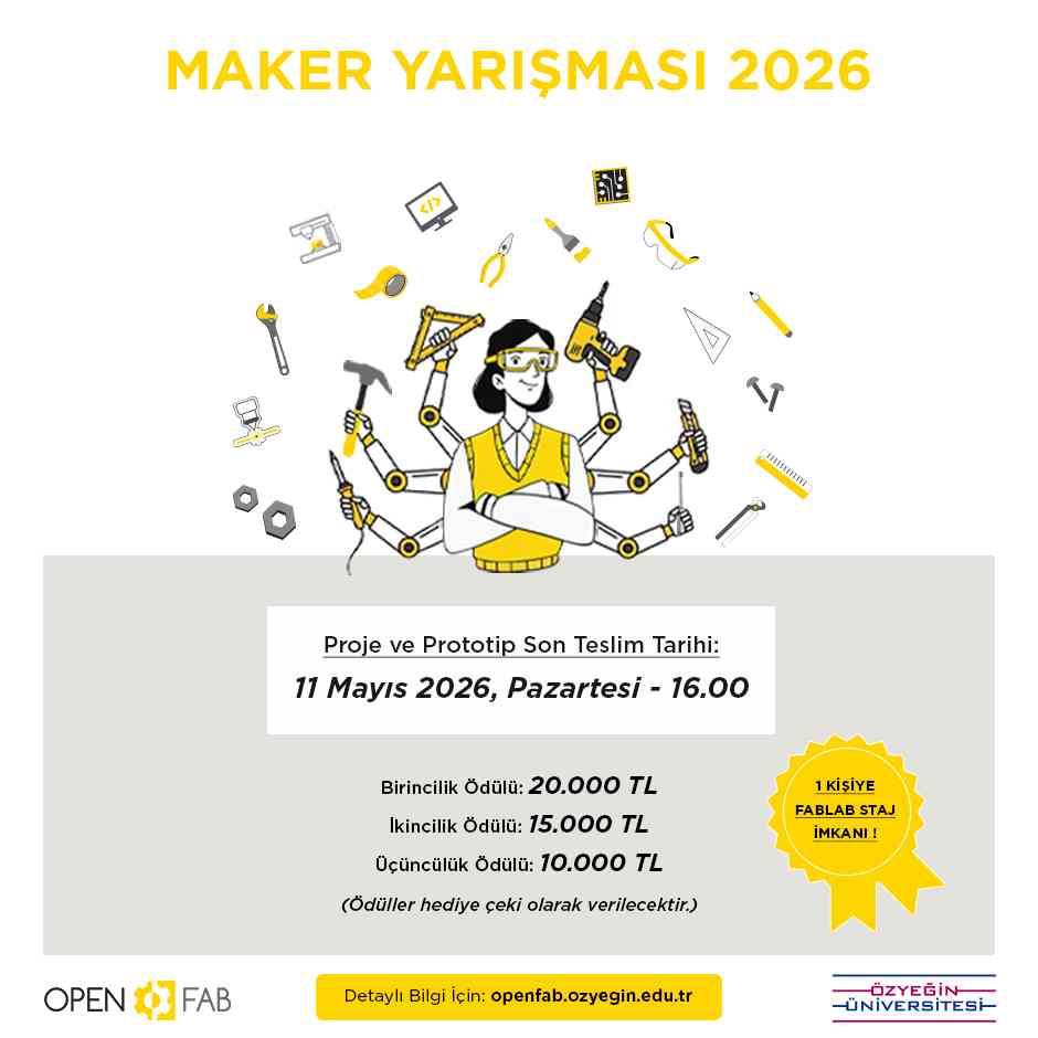 Bu sene ikincisi düzenlenen Maker Yarışması, yenilikçi fikirlerini gerçek hayat taşımak isteyen tüm ÖzÜ öğrencilerinin katılımına açık olarak gerçekleşecektir. Tasarımdan kodlamaya, sürdürülebilirlikten DIY projelerine, elektronikten giyilebilir teknolojilere, oyun tasarımından gıda tasarımına kadar farklı alanlarda proje üreten makerları arıyoruz! Bir tema kısıtlaması olmayan yarışma ile ilgili önemli tarihler: