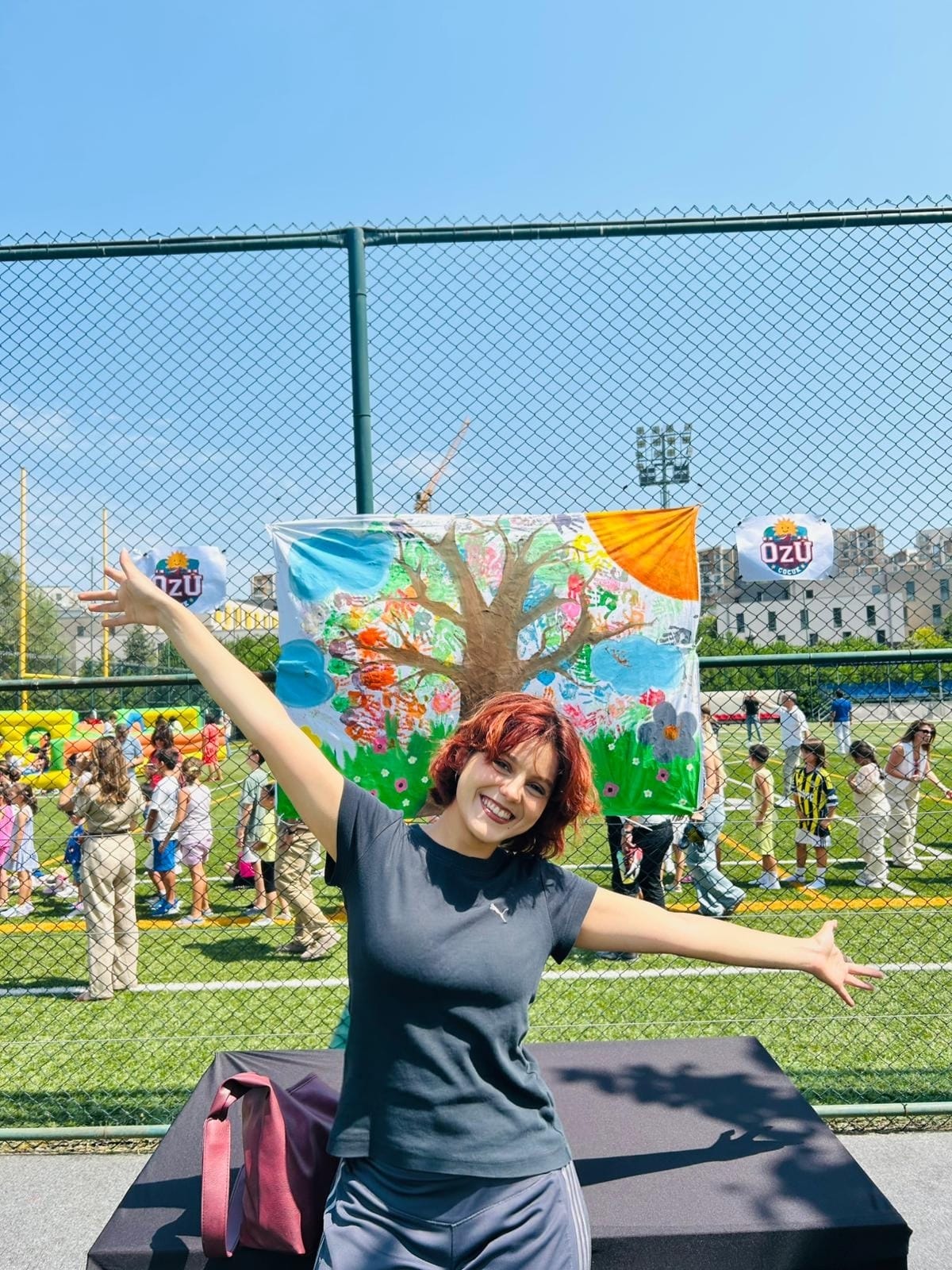 Tasarlamış olduğumuz pankartın tam ortasında köklü ve dalları uzun bir ağaç yer alıyor. Bu ağaç, Özyeğin Üniversitesi’nin köklerini ve büyüyen topluluğunu temsil ediyor. Yaprakları ise çocukların el baskılarından oluşuyor; her bir baskı, ağacın taze filizleri gibi canlılık ve umut yayıyor, sanki taze bir nefes alıyor. Ağacın etrafında yemyeşil çimenler ve renk renk çiçekler, gökyüzünde ise bulutlar ve sapsarı bir güneş var. Bu kompozisyon, pankarta bakanı anında çocukların neşesi ve enerjisiyle çevreliyor.